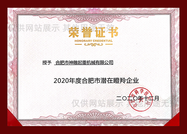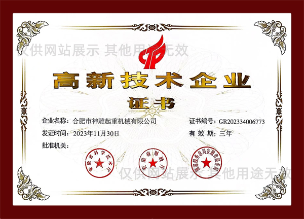 合肥神雕起重是高新技術企業,是安徽省科創板掛牌企業(證券代碼:630331),同時榮獲安徽市場質量、誠信五星級企業、合肥經濟圈示范企業、合肥市創新型企業、安徽省市場質量放心產品等榮譽稱號